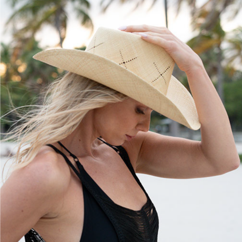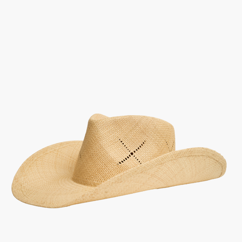 Meet the Gaia Straw Cowboy Hat, designed to stand out with effortless style and exceptional function. Its wide, curved brim offers superior sun protection, while the durable, tightly woven straw keeps its shape wear after wear. The exclusive MakiPalmata crown, marked with a bold “X,” adds a distinctive and sophisticated signature touch.